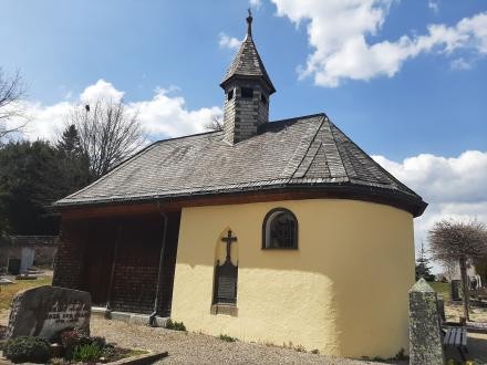 Als man 1818 den Friedhof von der Kirche hierher verlegte, wurde auch die Friedhofskapelle errichtet. Noch heute wird bei Beerdigungen das Glöcklein im Turm der kleinen Kapelle geläutet.