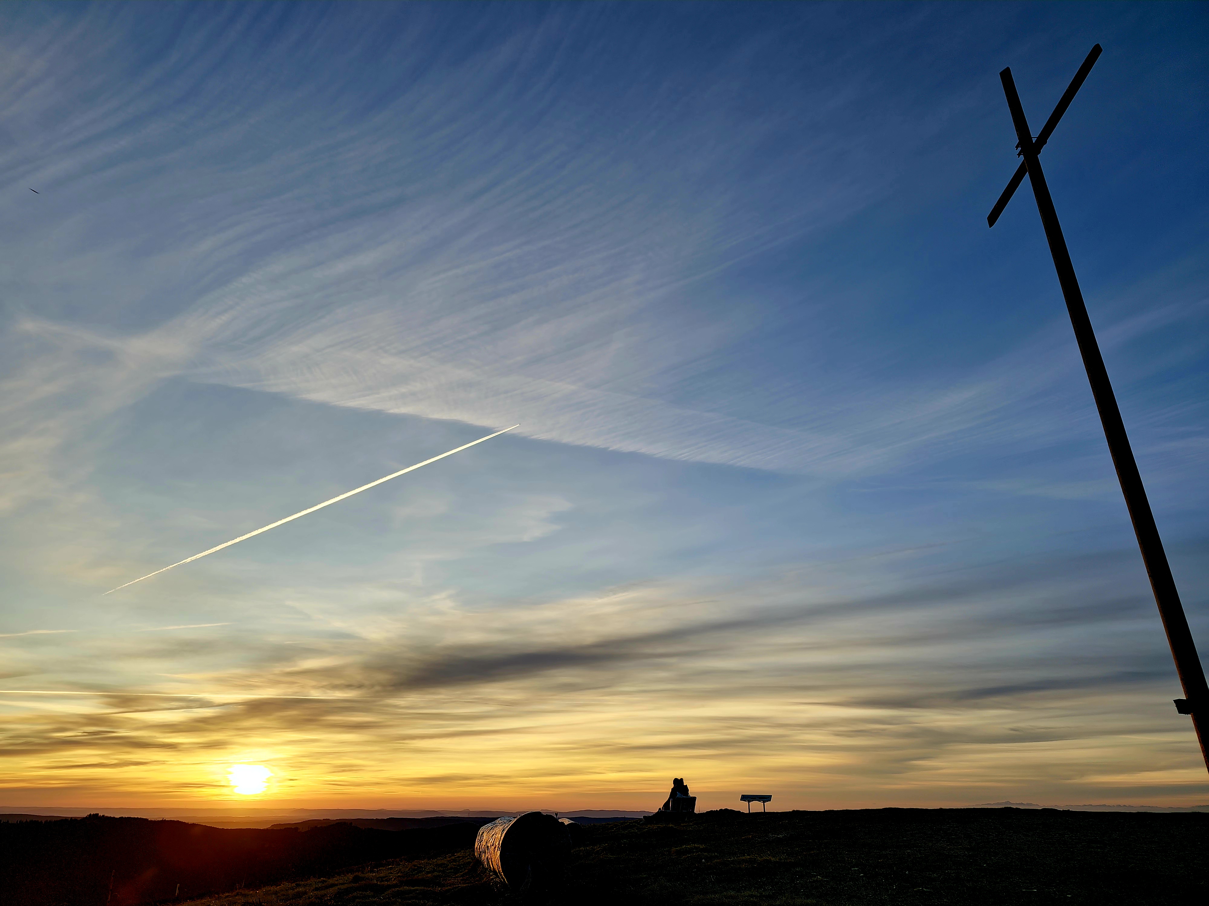 Ein wahres Farbenspiel am Himmel – von leuchtendem Orange bis tiefem Blau. Das Gipfelkreuz des Herzogenhorns ragt in die frühe Morgendämmerung, während zwei Personen in der Ferne diesen magischen Moment genießen. Eine Aufnahme, die die Schönheit und Ruhe der Feldberger Bergwelt eindrucksvoll einfängt.